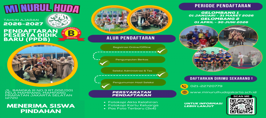 Penerimaan siswa baru telah dibuka! Bergabunglah dengan MI Nurul Huda bukan sekadar tempat belajar, tapi rumah kedua yang penuh semangat, nilai Islami, dan pre