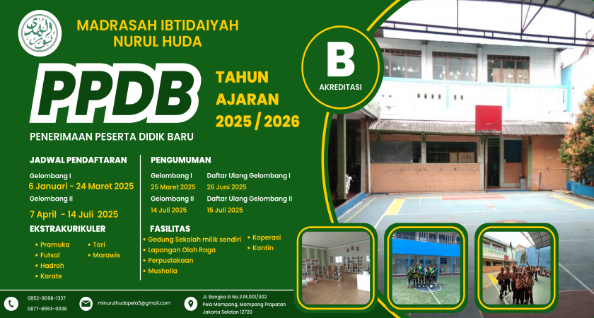 Dengan selogannya “Cerdas, berintegritas dan berakhlakul karimah” MI Nurul Huda mencoba menghadirkan pendidikan yang lebih menitik beratkan pada pembinaan moral dengan bernafaskan Islam. Dibina guru-guru berpengalaman dibidangnya dengan akreditasi B serta dukungan fasilitas gedung milik sendiri, lapangan olah raga, Perpustakaan serta sarana ibadah dan juga memiliki program unggulan Tahfidz Qur’an merupakan sekelumit alasan mengapa Kamu harus memilih MI Nurul Huda.
